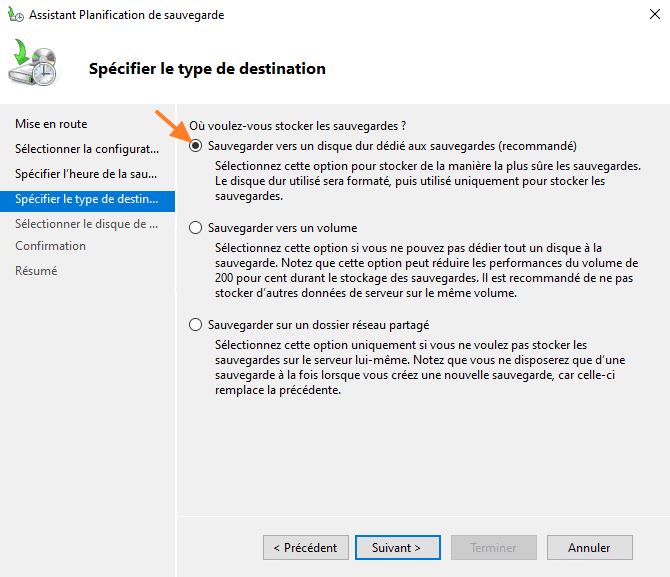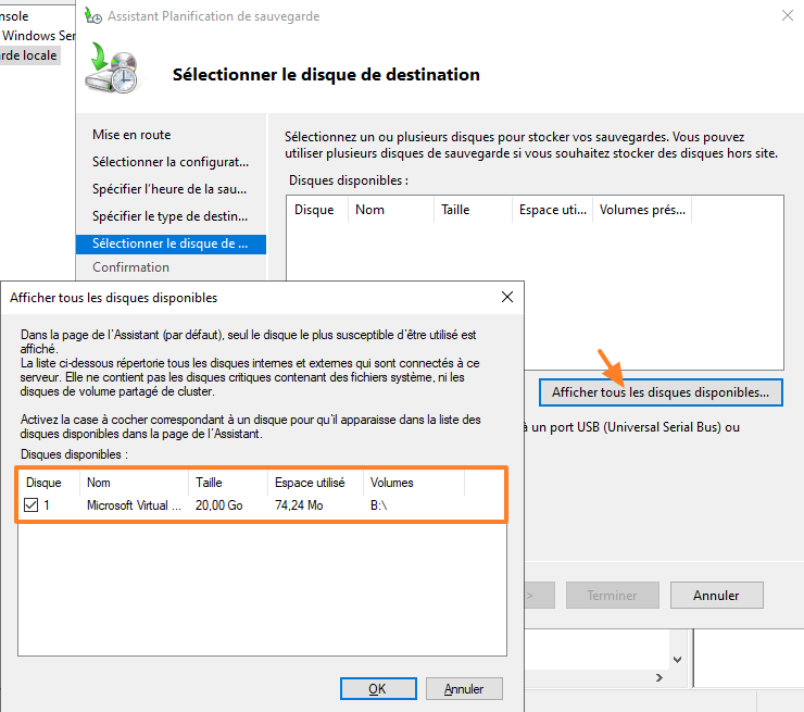 Puisque l'on souhaite effectuer la sauvegarder sur un disque dédié, il convient de choisir le disque à l'étape suivante. S'il s'agit d'une machine virtuelle, il peut s'agir d'un disque virtuel attaché directement à la VM, et dédié à ces sauvegardes.