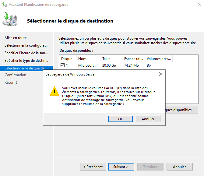 Un message d'avertissement car précédemment on a indiqué que l'on souhaitait sauvegarder le serveur complet, ce qui signifie que l'on souhaite inclure à la sauvegarde le disque de sauvegarde en lui-même. En cliquant sur "OK", on donne notre accord à l'outil de sauvegarde pour exclure le disque du job de sauvegarde. Ensuite, il faudra valider une seconde fois pour indiquer que l'on est d'accord que le disque soit formaté (information importante !).