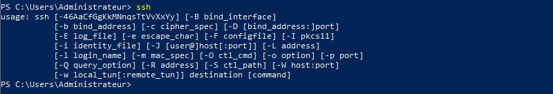 Dans ce tutoriel, nous allons utiliser deux utilitaires : le client SSH principal, à savoir ssh.exe, ainsi que scp.exe pour le transfert de fichiers. D'ailleurs, si vous exécutez ssh dans une console PowerShell ou une Invite de commande, vous verrez que l'aide s'affiche. Cela montre bien que l'outil est bien présent.