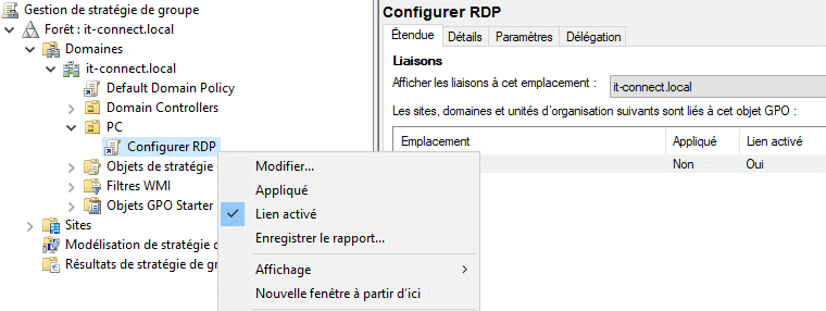 1- Ma GPO « GPO_RDP » s’applique sur l’OU « Ordinateurs » ( pour imager : la gpo dans dans le dossier Ordinateurs ) -> Dans l’onglet « Etendue » j’ai bien l’emplacement sur « Ordinateurs »
