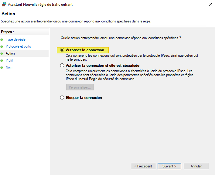 Cliquez sur "Autoriser la connexion" puisque nous souhaitons laisser passer ce flux.
