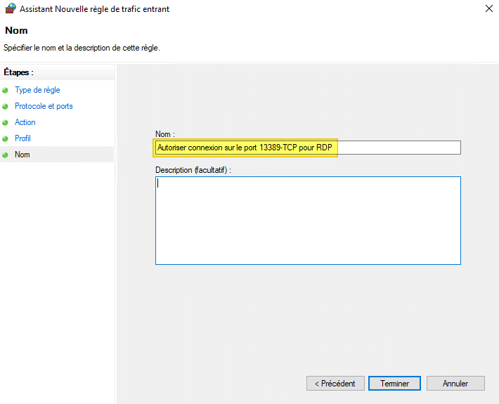 Choisissez "Autoriser la connexion" pour du RDP sur le port 3389, sinon choisissez "Bloquer la connexion" pour du RDP sur le port 13389 (puisque nous avons déjà créé une autre règle).