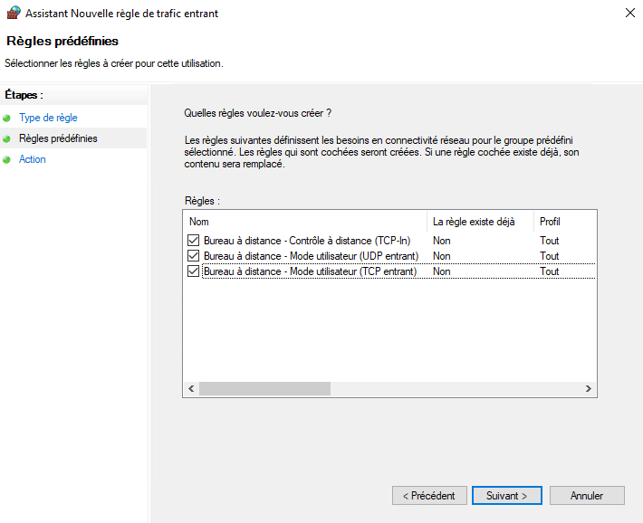Créez une nouvelle règle et choisissez "Prédéfinie" puis "Bureau à distance".