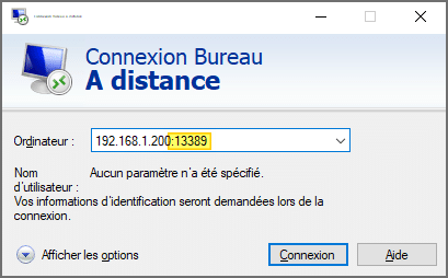 PS : pour se connecter en Bureau à distance sur un port personnalisé, il faut le spécifier à la suite de l'adresse IP / du nom d'hôte. Voici un exemple avec le numéro de port 13389.