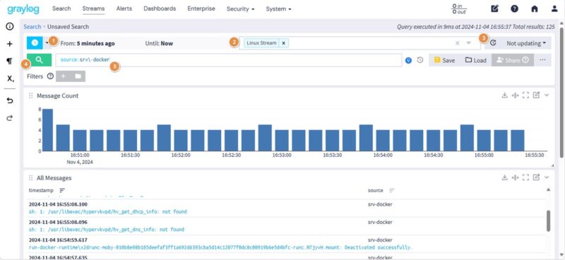 5 - Barre de saisie pour indiquer vos filtres de recherche. Ici, je précise "source:srv\-docker" pour afficher uniquement les journaux de la nouvelle machine sur laquelle je viens de configurer Rsyslog.