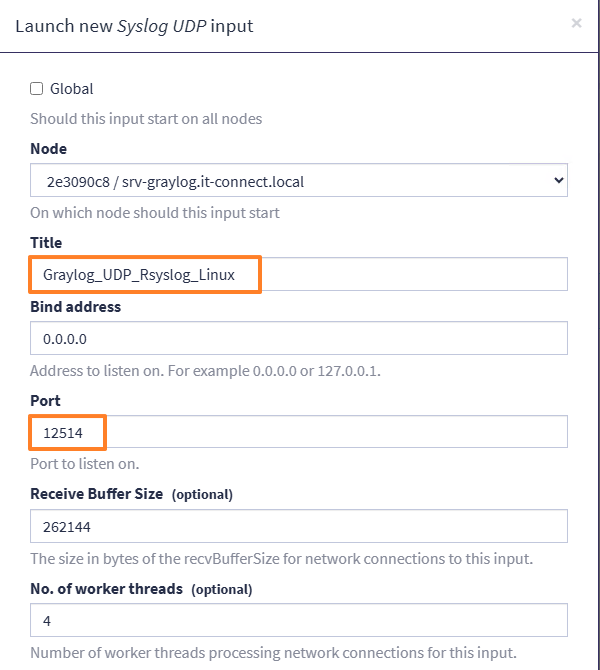 Un assistant va s'afficher à l'écran. Commencez par donner un nom à cet Input, par exemple "Graylog_UDP_Rsyslog_Linux" et choisissez un port. Par défaut, le port est "514" mais vous pouvez le personnaliser. Ici, le port "12514" est retenu.