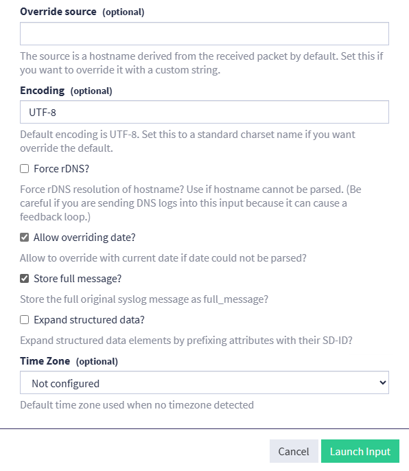 Vous pouvez aussi cocher l'option "Store full message" pour que le message de log complet soit stocké dans Graylog. Cliquez sur "Launch Input".