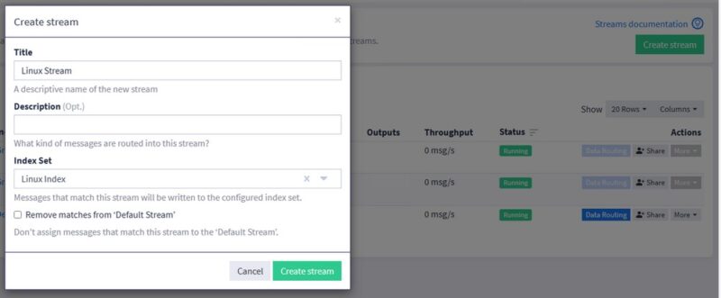 Pour créer un nouveau Stream, cliquez sur "Streams" dans le menu principal de Graylog. Ensuite, cliquez sur le bouton "Create stream" situé sur la droite. Dans la fenêtre qui apparaît, nommez le stream, par exemple "Linux Stream" et choisissez l'index "Linux Index" pour le champ nommé "Index Set". Validez.