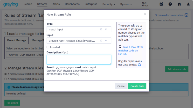 Choisissez le type "match input" et sélectionnez l'Input Rsyslog en UDP créée précédemment. Validez avec le bouton "Create Rule". Ainsi, tous les messages à destination de notre nouvel Input seront envoyés dans l'Index pour Linux.