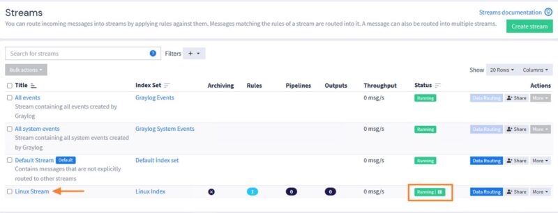 Votre nouveau Stream doit s'afficher dans la liste et il doit être sur l'état "Running". La bande passante de message indique "0 msg/s" car pour le moment, nous n'envoyons aucun journal vers l'Input Rsyslog UDP. Pour voir les journaux d'un stream, cliquez simplement sur son nom.