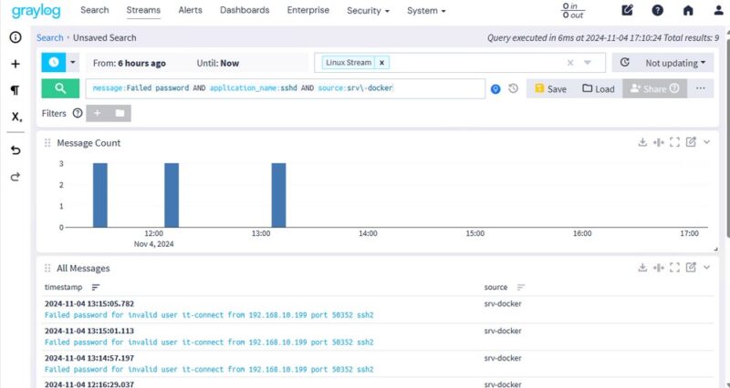 Sur Graylog, utilisez le filtre de recherche suivant pour afficher uniquement les messages correspondants :
