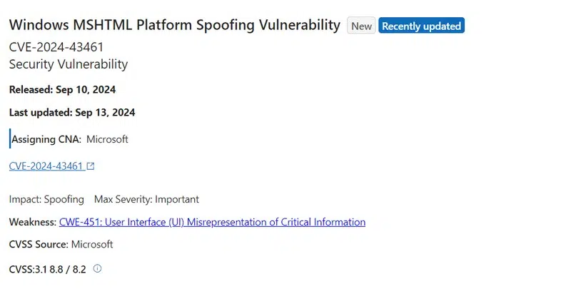 À l'occasion de la sortie de son Patch Tuesday de septembre 2024, Microsoft a corrigé plusieurs dizaines de vulnérabilités dans ses produits, dont la CVE-2024-43461 qui fait l'objet de cette alerte. À l'origine, cette vulnérabilité n'était pas considérée comme exploitée au sein de cyberattaques. Mais, vendredi dernier, Microsoft a actualisé son bulletin de sécurité après avoir confirmé l'exploitation de celle-ci.