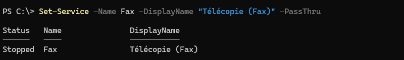 Set-Service -Name Fax -DisplayName "Télécopie (Fax)" -PassThru