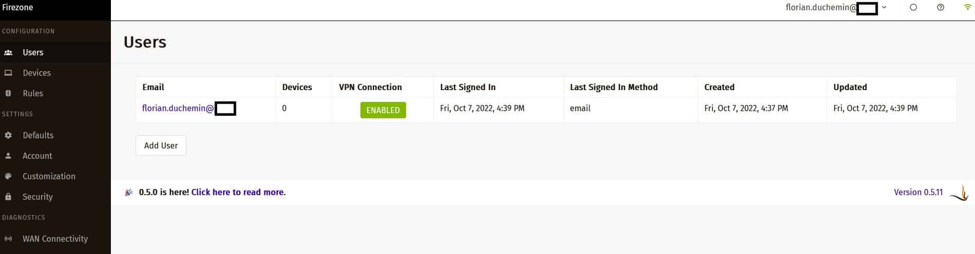 Par contre, il faut activer l’authentification multi-facteur (OTP) sur l’utilisateur qui se connectera a l’instance Firezone.