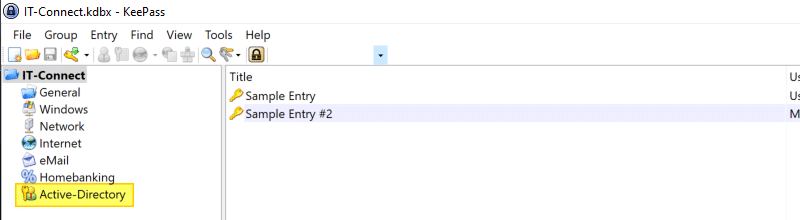 New-KeePassGroup -DatabaseProfileName "IT-Connect" -KeePassGroupName "Active-Directory" -IconName UserKey ` -MasterKey $KeePassMasterKey -KeePassGroupParentPath "IT-Connect"