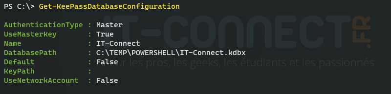 New-KeePassDatabaseConfiguration -DatabaseProfileName "IT-Connect" -DatabasePath "C:\TEMP\POWERSHELL\IT-Connect.kdbx" -UseMasterKey