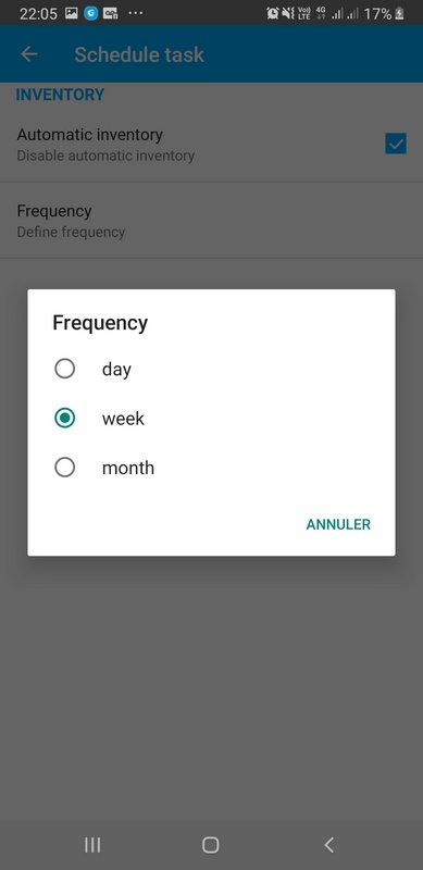 Le serveur est ajouté, maintenant nous allons activer l'inventaire automatique. Retournez sur l'écran d'accueil de l'application, et cette fois-ci appuyez sur "Schedule task". Cochez l'option "Automatic inventory" pour que l'appareil se synchronise automatiquement tous les jours, toutes les semaines ou tous les mois. Pour cela, cliquez sur "Frequency" et choisissez.
