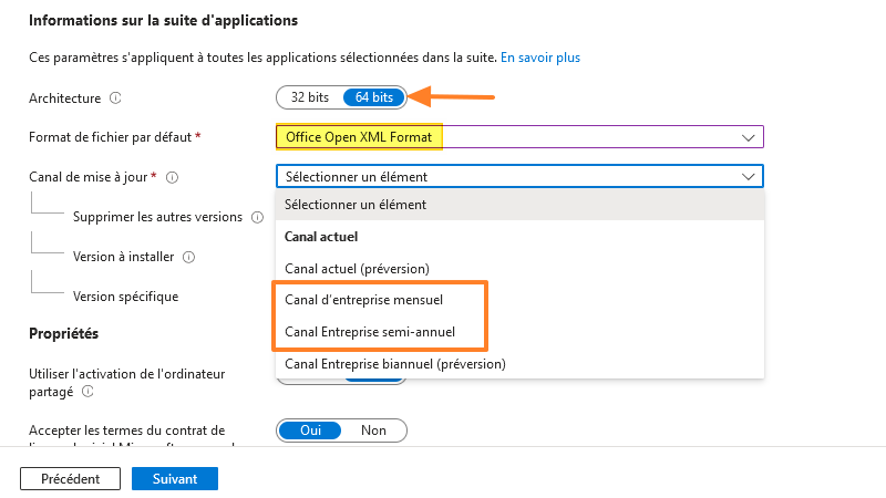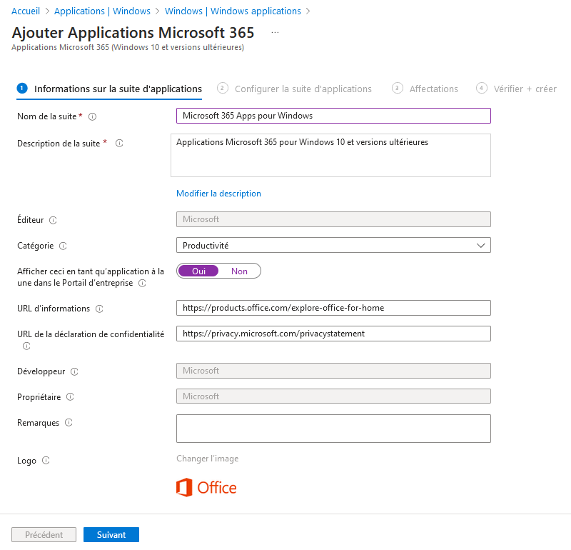 - Nom de la suite : vous pouvez corriger la valeur afin d'indiquer "Microsoft 365 Apps pour Windows".