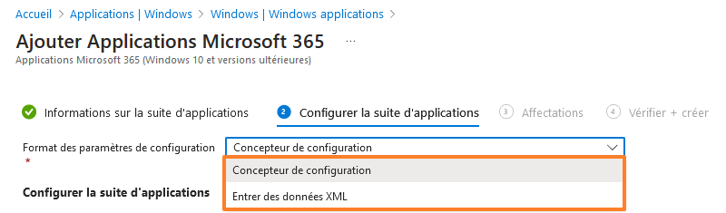 L'étape "Configurer la suite d'applications" se présente à vous. Vous avez le choix entre deux formats pour les paramètres de configuration :