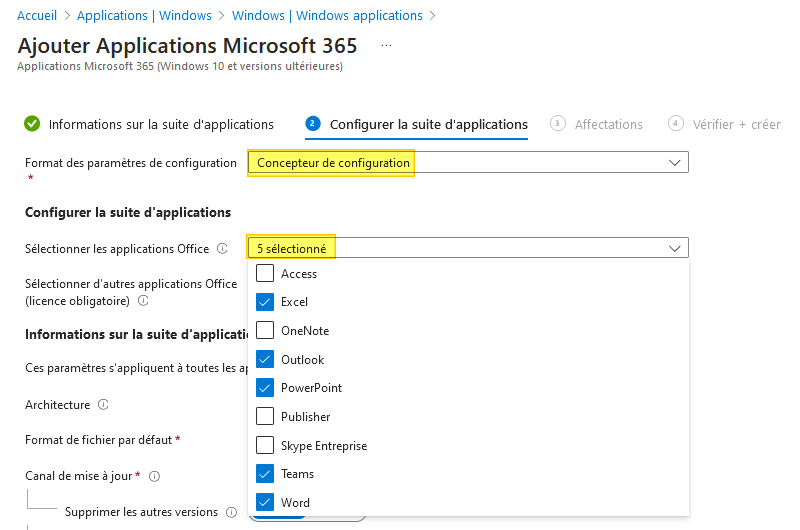 Le fait de choisir "Concepteur de configuration" donne accès à différentes options. Tout d'abord, nous pouvons choisir les applications Office que nous souhaitons installer. Dans cet exemple, seules 5 applications seront installées : Excel, Outlook, PowerPoint, Teams et Word. Via l'option "Sélectionner d'autres applications Office (licence obligatoire)", vous pouvez ajouter Visio et/ou Project, en supplément.