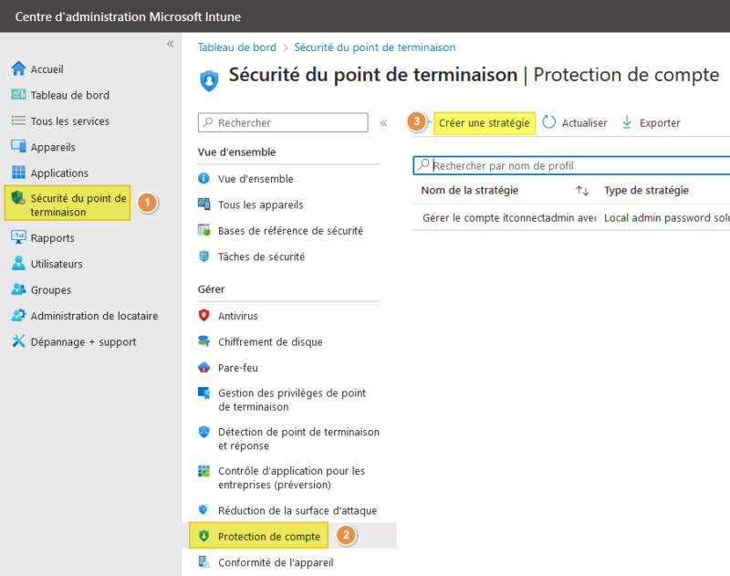 Cliquez sur la gauche sur "Sécurité du point de terminaison" (1), puis sur "Protection de compte" (2) afin de pouvoir "Créer une stratégie" (3). C'est également de cette façon que l'on peut définir une stratégie pour Windows LAPS.