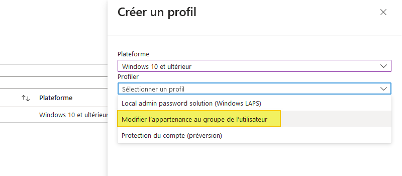 Choisissez la plateforme "Windows 10 et ultérieur", puis sélectionnez le profil "Modifier l'appartenance du groupe de l'utilisateur".