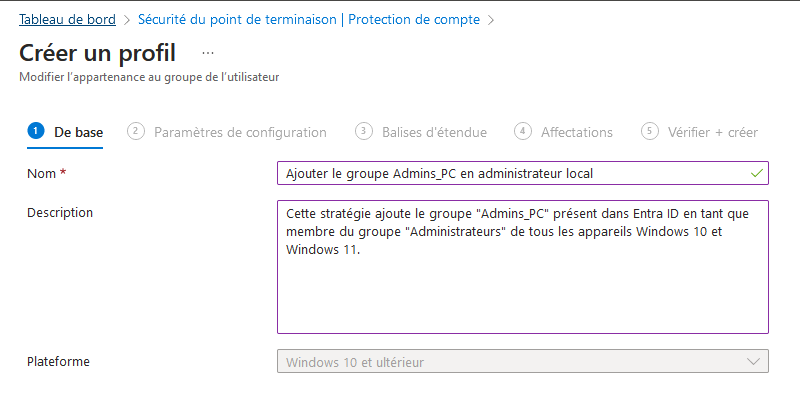 Remarque : si vous avez besoin de gérer le groupe "Administrateurs" local de machines jointes dans Entra ID (Azure AD) mais aussi pour des machines "hybrides", vous devez configurer deux stratégies distinctes. Ceci permettra d'éviter certaines erreurs d'application de la stratégie.