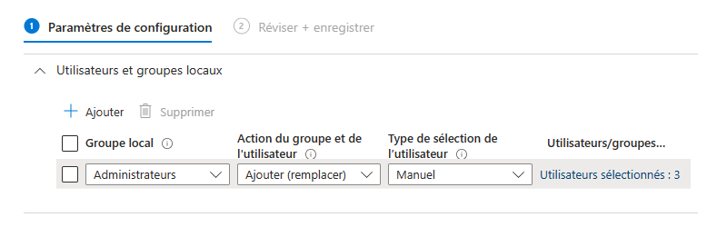 Voici la configuration obtenue. Attention, n'ajoutez pas plusieurs instructions "Ajouter (remplacer)" pour le même groupe local, sinon la seconde règle écrasera la première règle.