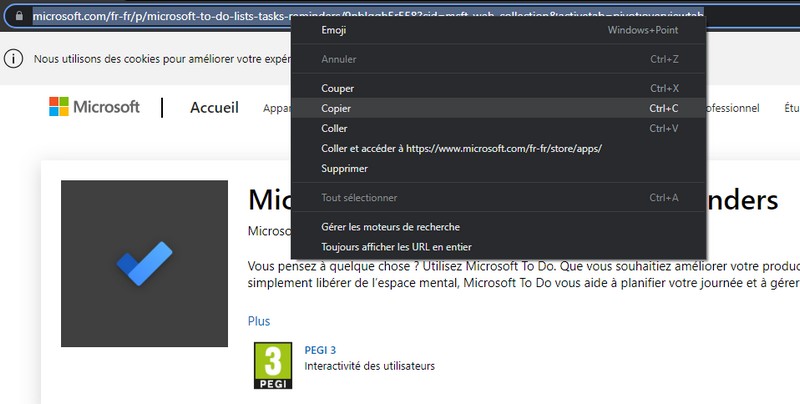Recherchez l'application qui vous intéresse, pour ma part Microsoft To-Do, et lorsque vous êtes sur la page de l'application, effectuer un "copier" de l'URL.