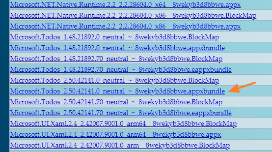 Une liste (assez longue) de résultats est retournée ! Nous avons plusieurs paquets différents et c'est normal. Le site affiche notre application Microsoft To-Do mais également les paquets correspondants aux dépendances. Je ne vous apprends rien si je vous dis que l'application ne fonctionnera pas sans ses dépendances.