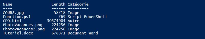 Dans ce nouvel exemple, nous allons utiliser Get-ChildItem, la commande qui sert à lister le contenu d'un dossier. L'idée est la suivante : à partir de la liste des fichiers et des extensions, créer une nouvelle propriété nommée "Catégorie" qui va permettre d'affecter une catégorie à chaque fichier.