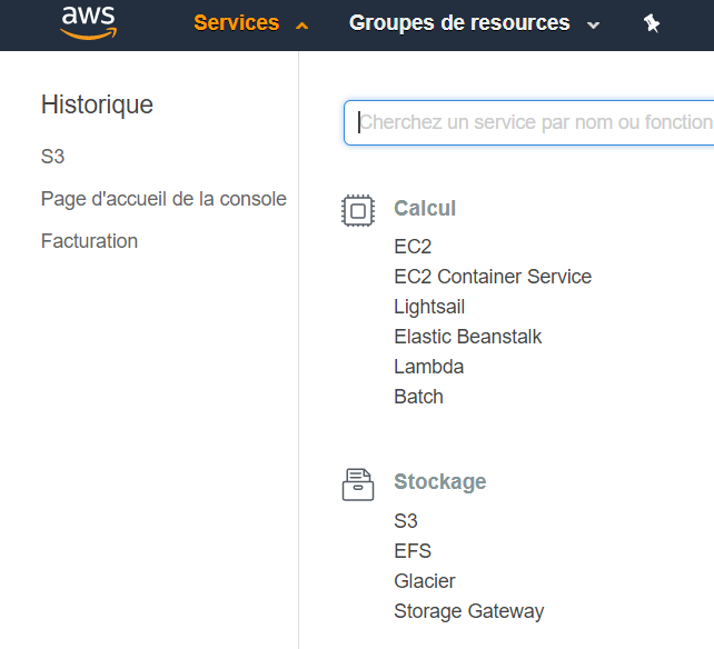 Commencez par créer un compte AWS ou vous connecter avec votre compte existant sur le portail aws.amazon.com. Ensuite dans le menu "Services" choisissez "S3" sous "Stockage".