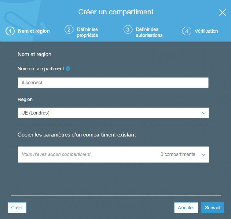 Donnez un nom à votre compartiment, par exemple "it-connect" et choisissez la région "UE (Londres)" qui est celle la plus proche de la France à l'heure actuelle.