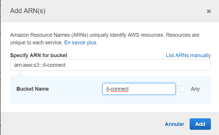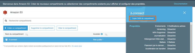 Le compartiment "it-connect" apparaît dans la liste, je vous invite à cliquer sur la ligne correspondante pour afficher les propriétés. Vous devez ensuite cliquer sur "Copier l'ARN du compartiment" car nous allons utiliser cet identifiant par la suite.