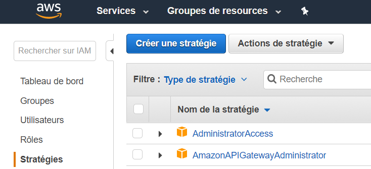 Dans le menu "Services", sous la section "Sécurité, Identité Et Conformité" cliquez sur "IAM" pour accéder au gestionnaire d'identités et des accès. Lorsque vous y êtes, sur la gauche allez dans "Stratégie" puis "Créer une stratégie".