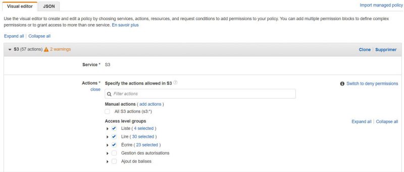 Choisissez le service "S3" et les droits "Liste", "Lire" et "Ecrire".