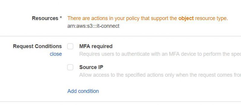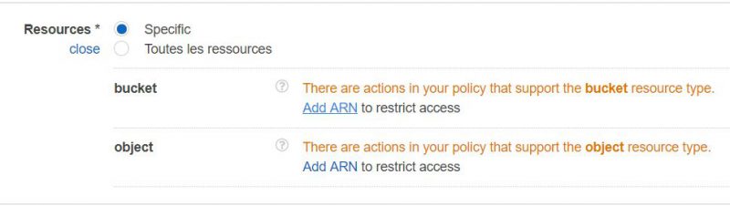 Dans le bas de la configuration, on va a utiliser "Specific" pour la ressource et au niveau du bucket, indiquez l'ARN de votre bucket (copié précédemment).