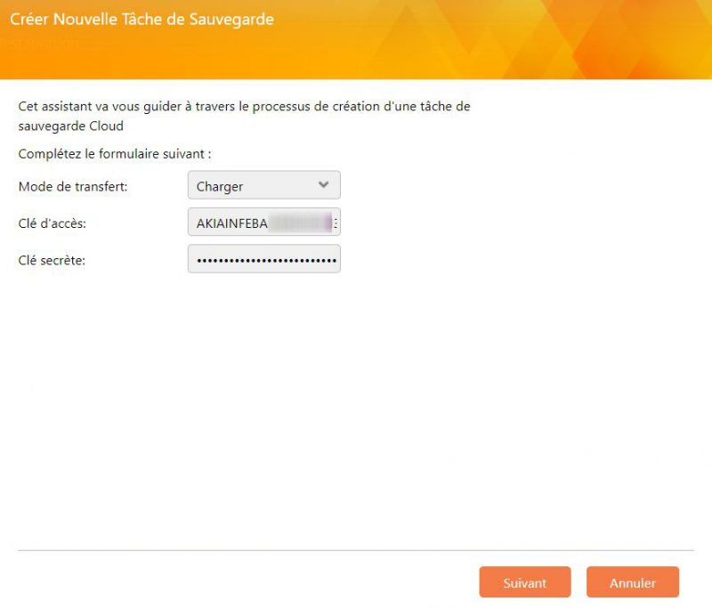 On va sélectionner le mode de transfert "Charger" car on va envoyer les données du NAS vers le Cloud Amazon S3. Vous devez aussi indiquer la clé d'accès et la clé secrète, deux valeurs récupérées sur l'interface d'AWS.