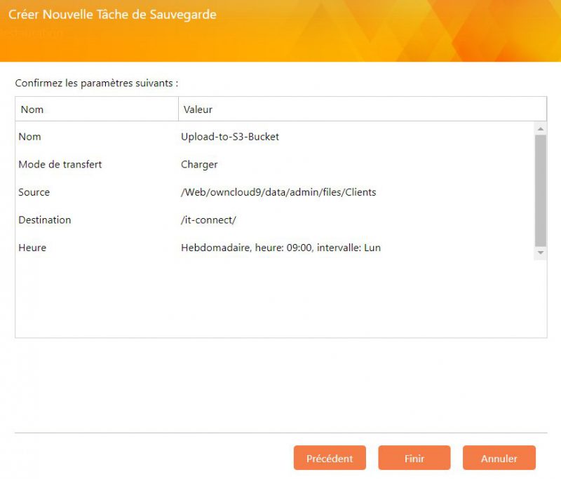 Vérifiez les paramètres et validez si ça vous convient, sinon revenez en arrière pour corriger. De toute façon, le job peut être édité ultérieurement.