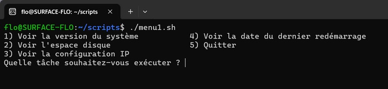 Nous allons illustrer cette méthode par la création d'un menu permettant à l'utilisateur de choisir d'afficher différentes informations au sujet de la machine locale : la version du système, l'espace disque, la configuration IP et la date du dernier redémarrage de la machine. Pour cette démonstration, Ubuntu via WSL est utilisé, mais il suffit de disposer de Bash.