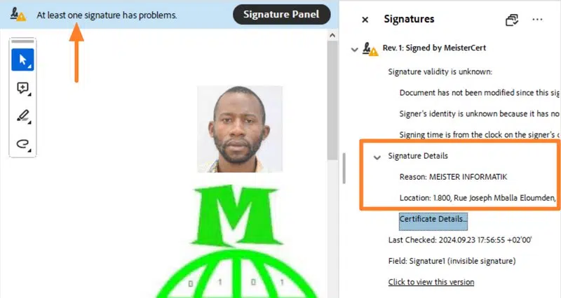 Si le document PDF est consulté à partir d'une machine qui ne dispose pas du certificat, la signature remonte « en erreur ». Néanmoins, elle est toujours présente et nous pouvons consulter ses détails comme le montre l'image ci-dessous.