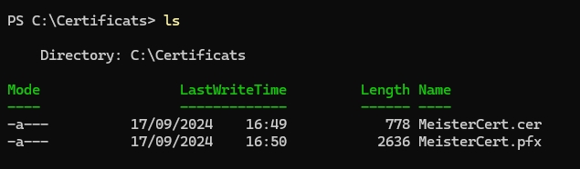 Et, si on va vérifier le contenu du dossier « Certificats » on doit pouvoir retrouver nos deux certificats, à savoir « MeisterCert.cer » et « MeisterCert.pfx ».
