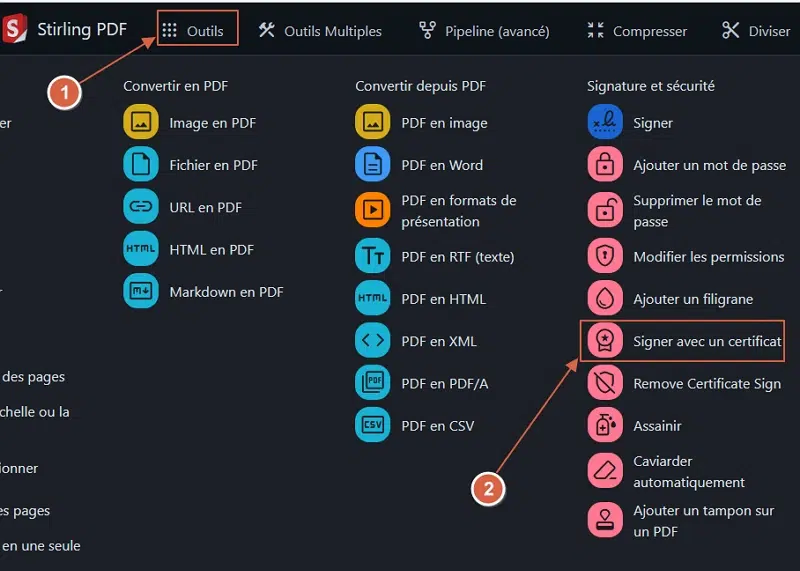 Une fois le certificat obtenu, on se rend sur Stirling PDF, puis sur « Outils » et on sélectionne « Signer avec un certificat ».
