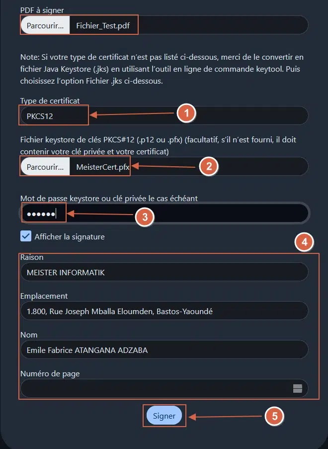 Ensuite, on va récupérer le certificat (« MeisterCert.pfx ») depuis son dossier. On insère le mot de passe utilisé pour protéger le certificat et on insère quelques informations relatives au signataire (raison, emplacement, nom). Puis, on spécifie le nombre de pages du document sur lesquelles on souhaite appliquer la signature (cette dernière s’appliquera par défaut sur l’ensemble des pages au si on ne spécifie rien) et on valide enfin en cliquant sur le bouton « Signer ».