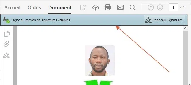 Une fois le fichier signé généré, on peut aller vérifier sa signature en l’ouvrant directement à l’aide d’un éditeur PDF (« Adobe Acrobat Reader », par exemple) et on peut directement observer une banderole au-dessus de ce dernier où il est écrit « Signé au moyen de signatures valables ».