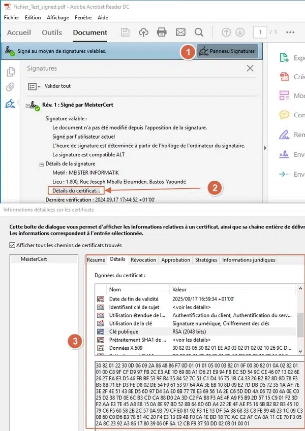 Et, si on clique sur « Panneau Signatures » en haut à droite, on peut obtenir quelques informations sur le signataire du document (surtout celles rentrées avant de générer le fichier signé). On peut même aller plus loin en allant cliquer sur « Détails du certificat » pour obtenir un peu plus d’informations sur ce dernier (notamment sa clé publique qu’on pourra aller vérifier chez son autorité de certification).