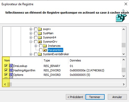 Ensuite, parcourez l'arborescence du Registre jusqu'à pouvoir cocher les 4 valeurs que nous souhaitons importer. Cliquez sur "Terminer".