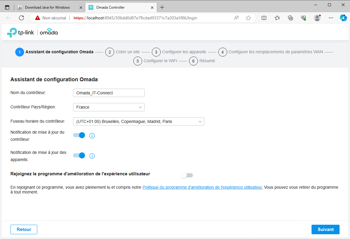 - Nommer le contrôleur Omada, choisir un pays et définir un fuseau horaire