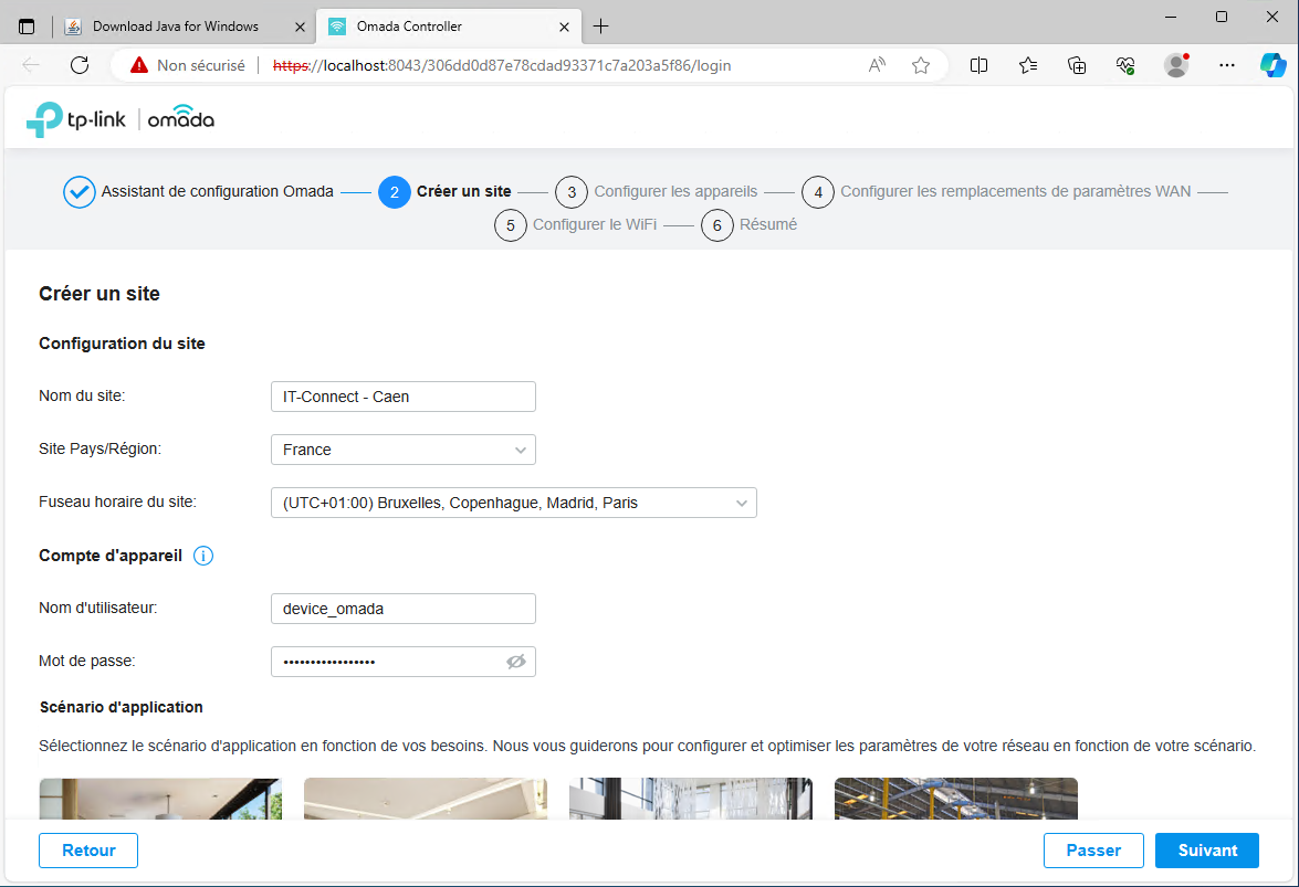- Créer un premier site (ce qui permettra de lui associer des équipements), définir le nom d'utilisateur et le mot de passe du compte admin qui devra être poussé sur les périphériques de ce site et sélectionner un scénario de déploiement (pour qu'Omada guide l'utilisateur en fonction de ce choix)