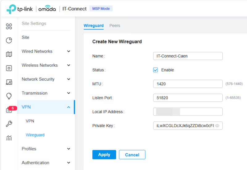 Une fois la configuration établie, copiez la clé publique car nous allons devoir la déclarer sur Omada et cliquez sur "Enregistrer".